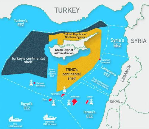 During explorations in 2011, the Noble-Delek duo also reported gas finds in the putative exclusive economic zone (EEZ) of the Greek Cypriot administration – a unilaterally declared area. The Aphrodite field, estimated to harbor 128 bcm of gas, has so far seen no progress regarding the commercialization of the resources because of the 40-year long conflict between the TRNC and the Greek Cypriot administration. Turkey and the TRNC contest the unilateral claims of the Greek Cypriot administration and do not recognize the maritime border delimitation agreements signed with Egypt, Lebanon and Israel.