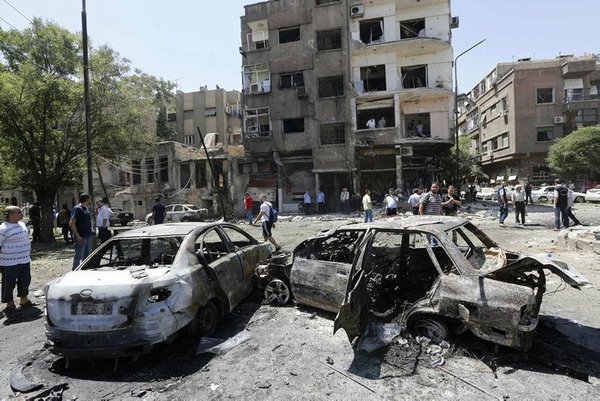 * Charred vehicles are seen on the site of a suicide bomb attack in the Syrian capital's eastern Tahrir Square district, on July 2, 2017. (AFP)