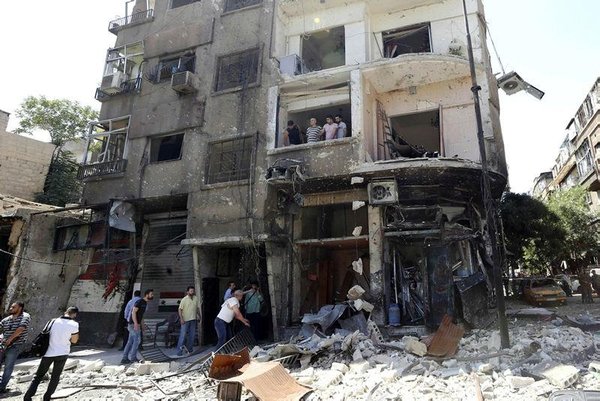 Syrians inspect the damage at the site of a suicide bomb attack in the capital's eastern Tahrir Square district, on July 2, 2017. (AFP)