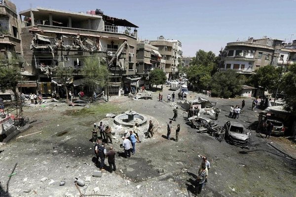 Syrians inspect the site of a suicide bomb attack in the capital's eastern Tahrir Square district, on July 2, 2017. (AFP)