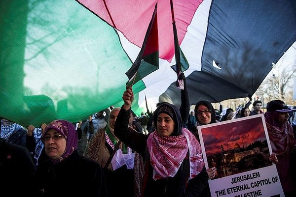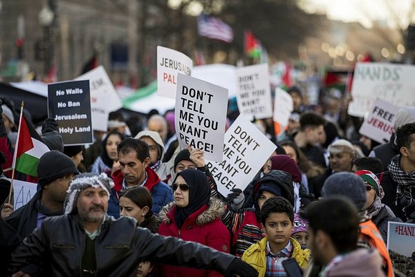Protestors chanted against Israel and Trump's decision on Jerusalem, carried banners reading "Stop the occupation in Palestine now", "Jerusalem belongs to Palestinians" and "We reject Trump's decision". The event ended in front of U.S. Congress without conflict.