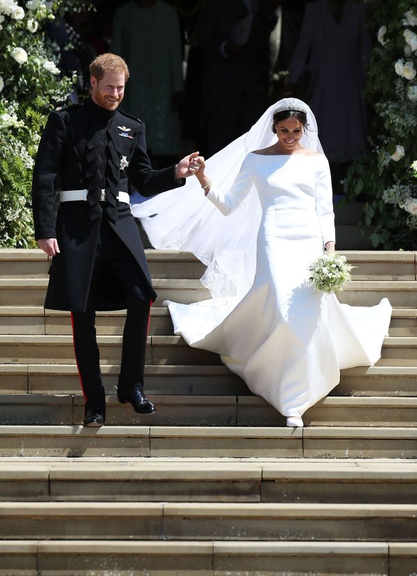 Her flowing white dress was designed by Clare Waight Keller at the French fashion house Givenchy. Made from a double bonded silk cady, it contains floral designs from all 53 Commonwealth countries.