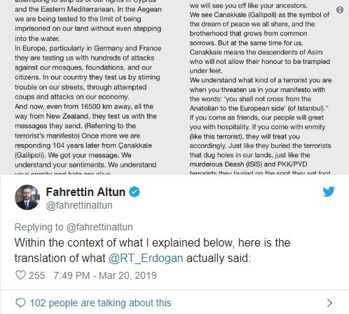 "President #Erdogan's words were unfortunately taken out of context. He was responding to the so-called 'manifesto' of the terrorist who killed 50 innocent Muslims in Christchurch, New Zealand," Altun said on Twitter.
