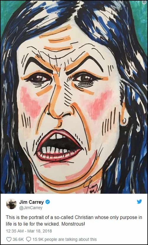 Carrey tweeted to his 17.8 million followers Saturday night the colorful painting of the dark-haired woman, as well as a harsh message for his unnamed subject: "This is the portrait of a so-called Christian whose only purpose in life is to lie for the wicked. Monstrous!"