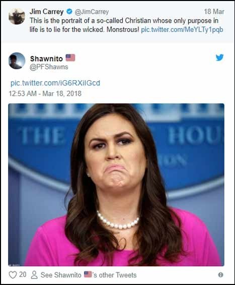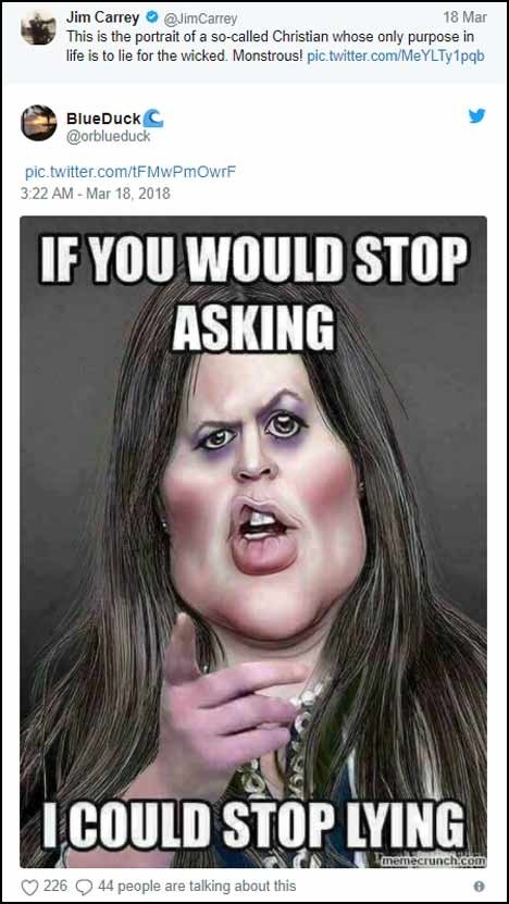 Actor Jim Carrey shared a portrait on his Twitter account of an angry looking woman he called a so-called Christian and a liar that was quickly compared to White House spokeswoman Sarah Huckabee Sanders.