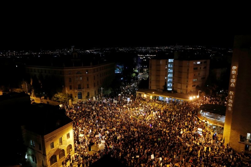 The protests took place at scores of intersections and bridges, where people held banners accusing Netanyahu of "failure" and calling for his resignation, as well as outside his private residence in the northern town Caesarea.