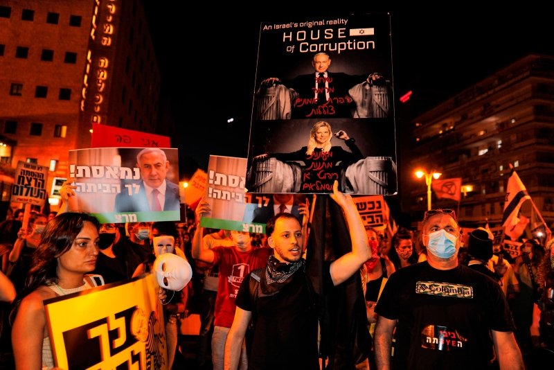 Wearing face masks to forestall coronavirus transmission, protestors carried signs accusing Netanyahu, whose graft trial is ongoing at the Jerusalem district court, of corruption and failing to resolve the coronavirus crisis and the related economic malaise.