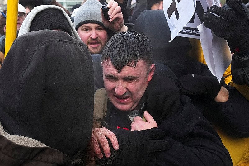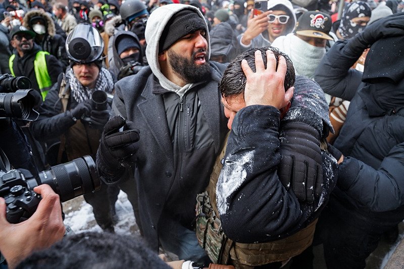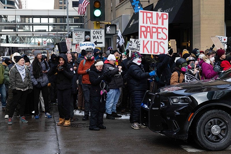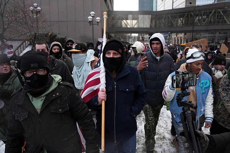 Waving signs and screaming chants that called for U.S. Immigration and Customs Enforcement and Border Patrol agents to leave Minneapolis, the anti-ICE protesters gathered downtown near City Hall. Scores of them moved forward, forcing about 10 far-right demonstrators against the outside of the municipal government center within minutes. Some in the crowd tossed water balloons that soaked the right-wing demonstrators as temperatures hit -4 degrees Fahrenheit (-20 Celsius) with the wind chill.