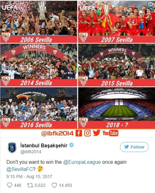 A day before the match Başakşehir tweeted a collage of photos showing Sevilla lifting the Europa League cup, Europe's second most prestigious club trophy, asking: "Don't you want to win the Europa League again?"