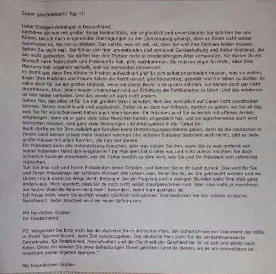 "Do yourself and your president a favor, and return to your country," the letter read, claiming that those who voted in favor of the presidential system in Turkey were not well-integrated into Germany.