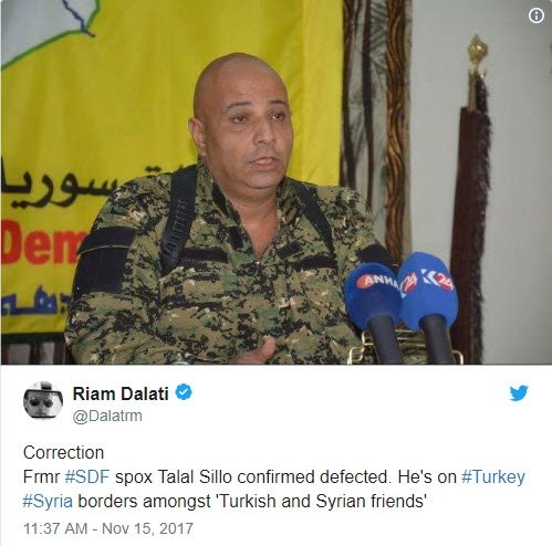 Talal Sillo, a high-rank commander and acting spokesperson of US-backed Syrian Democratic Forces (SDF), defected from the PKK-aligned group and crossed into Turkey from Free Syrian Army-held Jarablous, reports said Wednesday.