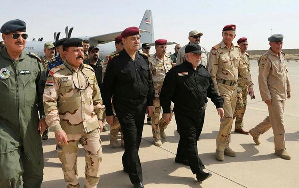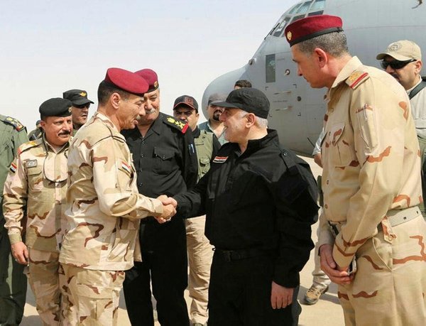 * A handout picture released by the Iraqi prime minister's press office on July 9, 2017, shows Iraqi Prime Minister Haider al-Abadi (c) shaking hands with army officers upon his arrival in Mosul. (AFP)