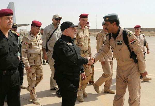 * A handout picture released by the Iraqi prime minister's press office on July 9, 2017, shows Iraqi Prime Minister Haider al-Abadi (C-R) shaking hands with army officers upon his arrival in Mosul. (AFP)