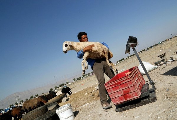 * An Iranian man holds a sacrificial sheep to weight it for upcoming Eid al-Adha celebrations are seen at a cattle market in the city of Andisheh, Alborz province, Iran, 30 August 2017. (EPA Photo)