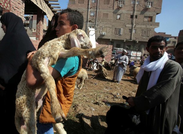 * An Egyptian potential buyer holds sheep ahead of the Eid al-Adha at a local market in Kerdasa, Giza, Egypt, 28 August 2017. (EPA Photo)