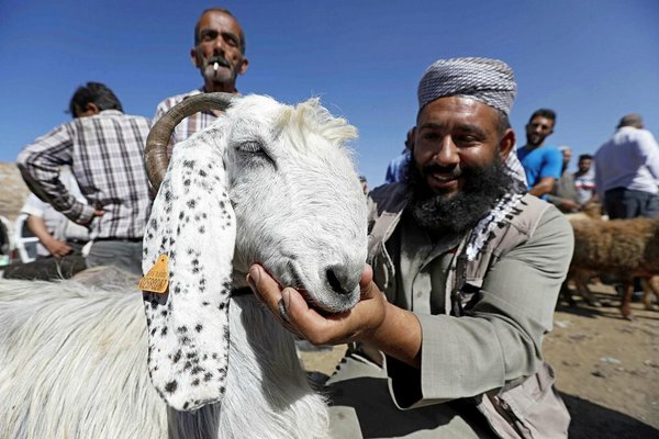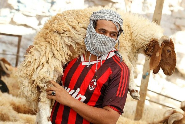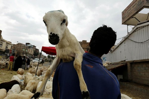 * A Yemeni carries a sheep ahead of the Eid al-Adha festival at a livestock market in Sana'a, Yemen, 28 August 2017. (EPA Photo)