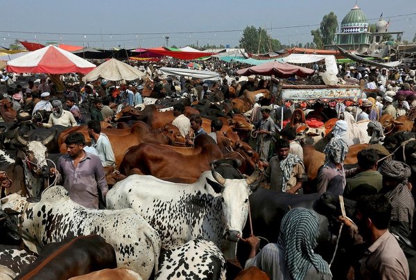 * People visit a cattle livestock market set up for the Muslim Eid al-Adha holiday in Peshawar, Pakistan, Wednesday, Aug. 30, 2017. (AP Photo)