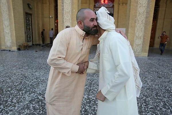 * Iraqi Sunni Muslims exchange greetings after prayers at the 17th Ramadan mosque on the first day of Eid al-Adha in Baghdad (AP Photo)