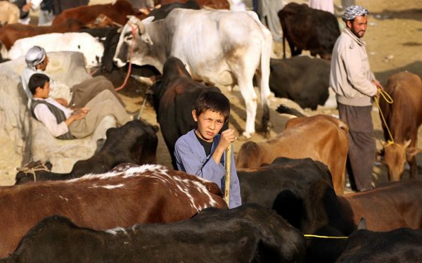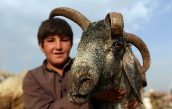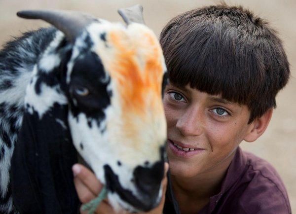 * An Afghan boy poses for a photograph as he waits for customers at a livestock market set up for the upcoming Muslim Eid al-Adha holiday, in Kabul, Afghanistan, Tuesday, Aug. 29, 2017. (AP Photo)