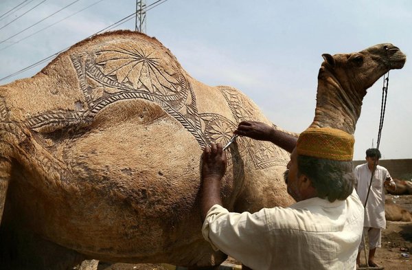 * A vendor decorates a sacrificial camel ahead of the Eid al-Adha festival, in Karachi, Pakistan, 23 August 2016. (EPA Photo)