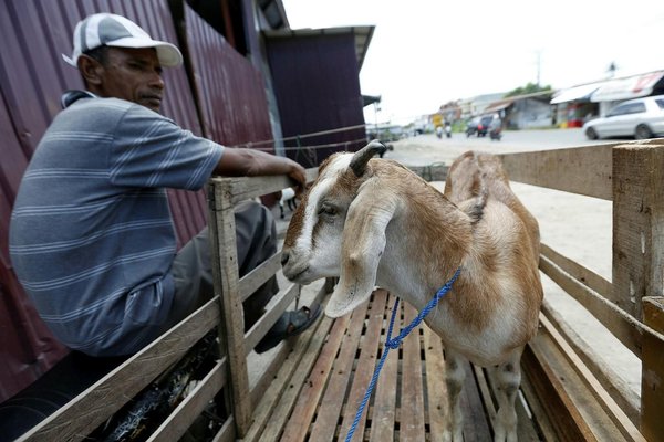 * A seller waits for customers to buy his goat as a sacrificial animal for the upcoming Eid al-Adha festival at Banda Aceh, Indonesia, 31 August 2017. (EPA Photo)