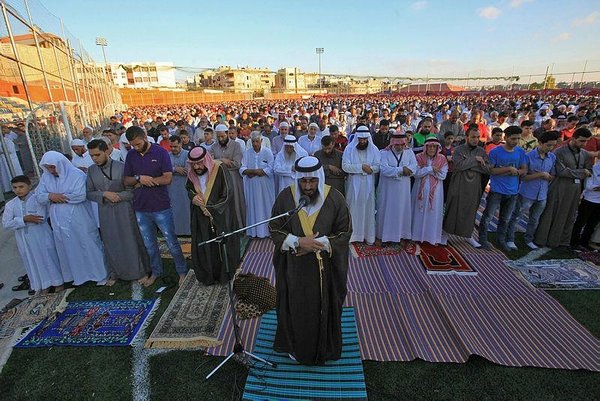 * Muslims pray to mark the first day of Eid al-Adha or "Feast of Sacrifice" holiday, at the main square in Nusseirat refugee camp, central Gaza Strip (AP Photo)