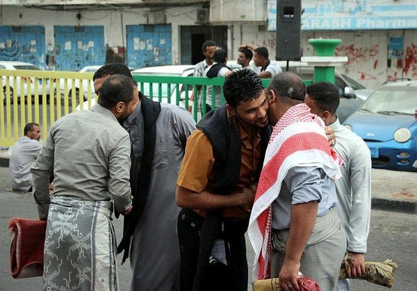 * Yemeni Muslims hug each other during Eid al-Adha celebrations in the southern port city of Aden (EPA Photo)