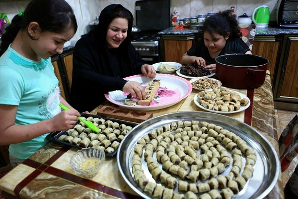 * An Iraqi mother and her children prepare cookies for the upcoming Muslim Eid al-Adha holiday in Basra, 340 miles (550 kilometers) southeast of Baghdad, Iraq, Thursday, Aug. 31, 2017. (AP Photo)
