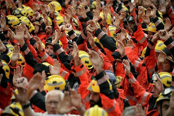 * Firefighters raise their hands during a general strike in Barcelona called by Catalan unions on October 3, 2017. (AFP)
