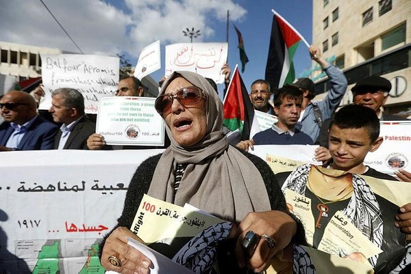 Thousands of Palestinians took to the streets across the Israeli-occupied West Bank on Thursday to mark the passage of 100 years since the Balfour Declaration, which laid the groundwork for Israel's establishment -- and their displacement -- in 1948.