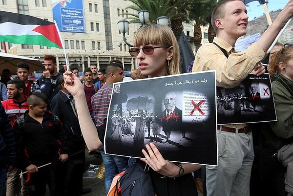 In Ramallah, Palestinians marched from the tomb of resistance icon Yasser Arafat to the British Cultural Center in the city's center, where they gave a letter to British officials demanding an official apology.