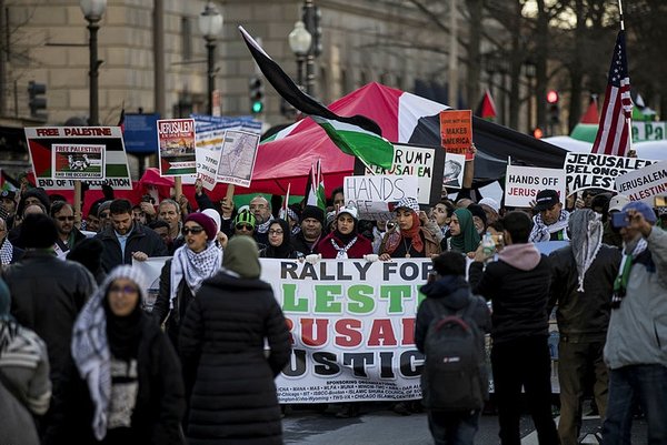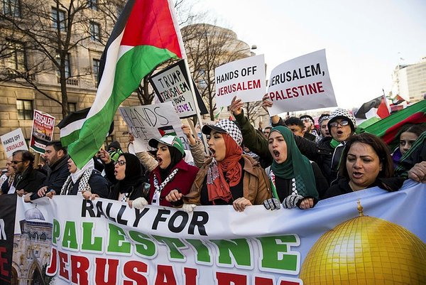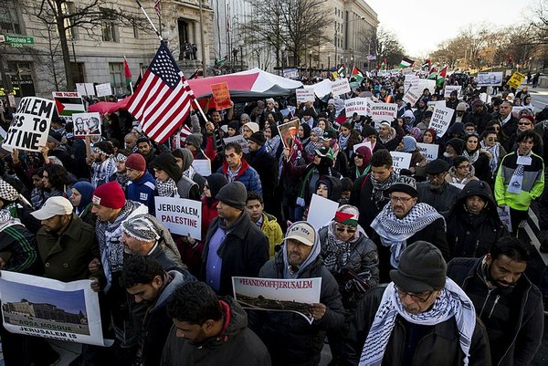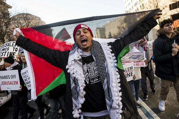 Protestors chanted against Israel and Trump's decision on Jerusalem, carried banners reading "Stop the occupation in Palestine now", "Jerusalem belongs to Palestinians" and "We reject Trump's decision". The event ended in front of U.S. Congress without conflict.