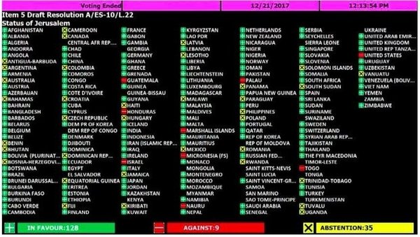 Trump had threatened to cut off financial aid to countries that voted in favor. His warning did appear to have some impact with nine countries voting against the resolution and 35 abstaining.