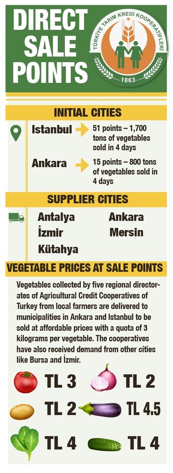 The vegetables sold at municipal direct sale points are supplied from five regional directorates of the Agricultural Credit Cooperatives of Turkey, including Antalya, İzmir, Kütahya, Mersin and Ankara, the spokesperson for the cooperative's general directorate said on the phone.
