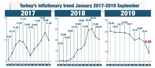 In line with market expectations, Turkish consumer prices slipped to 9.26% in September, compared to 24.52% in September 2018, according to the data from the Turkish Statistical Institute (TurkStat) released Thursday. The data revealed that inflation dropped to single digits for the first time since July 2017, when consumer prices came in at 9.79%. The steep decline in inflation, which had become a pressing issue for the Turkish economy in the last year, was the result of expanded efforts, a more stable lira, lowering demand and the fading effect of last year's price spike. Last month, annual inflation went down 5.75 percentage points from 15.01% in August.