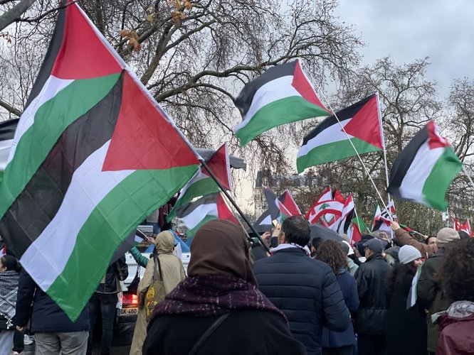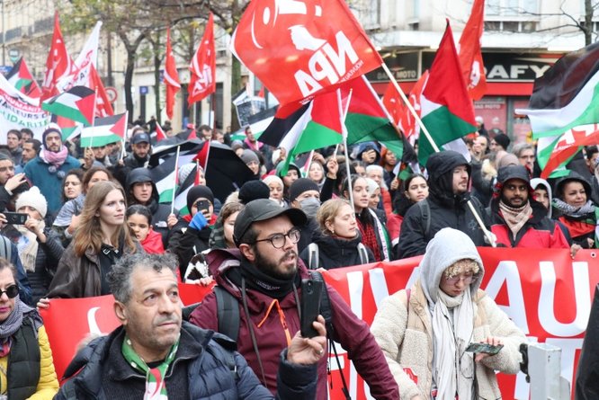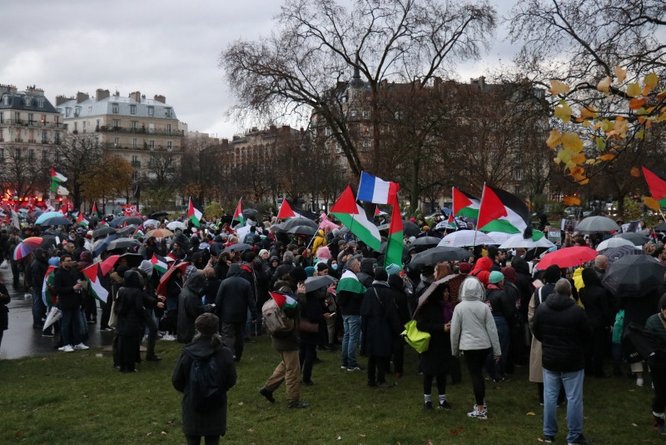 Carrying Palestinian flags and wearing Palestinian keffiyehs around their necks, the demonstrators chanted slogans such as "Free Palestine," "Gaza, Paris is with you," and "Gaza, we are all with you."