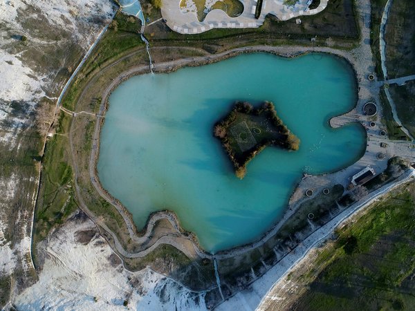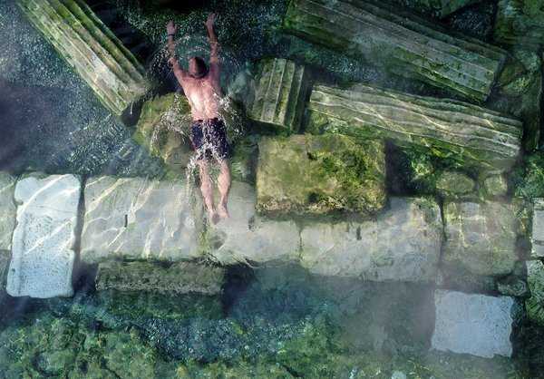 A natural spring, situated at a close proximity to the white terraces of travertine, is particularly popular with tourists. Dating from ancient Hierapolis, this pool formed naturally after the collapse of a series of columns in an earthquake in 692 AD, which caused thermal water to accumulate.