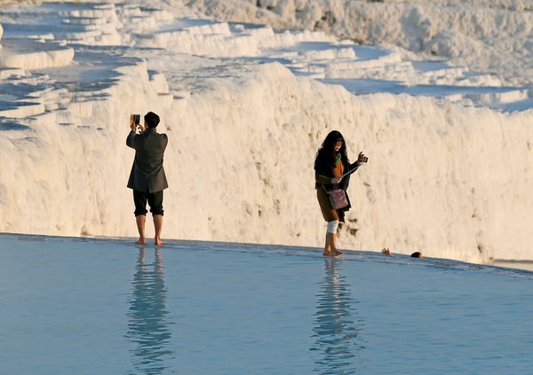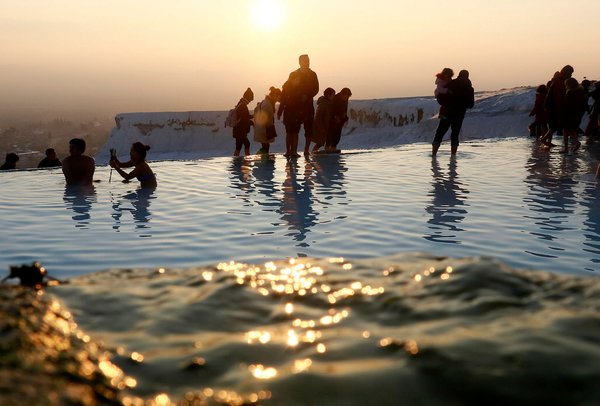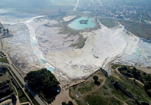 Located in Turkey's southwestern province of Denizli, the Pamukkale site, standing over the ruins of the ancient city of Hierapolis, has been known as a spa town and thermal treatment center for millennia since the Roman times, and especially famous for its white limestone travertines, shaped by calcium-rich hot springs.