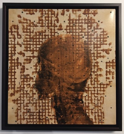 One of his exhibited works particularly conjures the appearance of old, vintage maps from the Age of Exploration in the three centuries following the earliest American colonizations. Its concentric circles are deftly placed to accent the effect of seeing worlds within worlds, drawing from endless cartographies where boundaries overlap and dissolve like his persistent use of corroding metal to signify the impermanence and statelessness of the most enduring of all that is manmade, from construction materials to the ideal of unity. His geometrical outlines detail inhuman visions in which skeletal x-rays and encapsulated cities are shot through with the connecting dots of microchip infrastructures and microcosmic gridlock.
