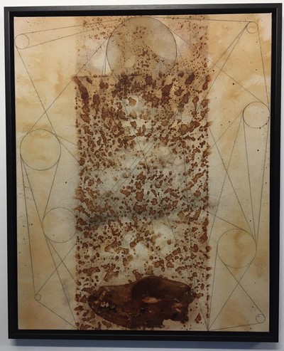 A buyer walked in and immediately seized "Untitled" (2018) -- in fact, all of his pieces are untitled -- a well-composed rust, acrylic and collage on canvas that Çerkez had fashioned sometime within the brief month and a half before the exhibition opened. Its diagrammatic circulation of meshed and haloed patterns distills the central theme of the exhibition, "Stateless Maps" with characteristic subtlety and precise technique.