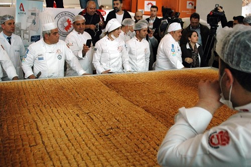 A 515 kilograms (1,135 pounds) baklava was prepared by a team of baklava masters from around Turkey and was baked on a single tray in a special oven as part of Travelexpo's Third International Tourism Fair at the international convention hall ATO Congresium.