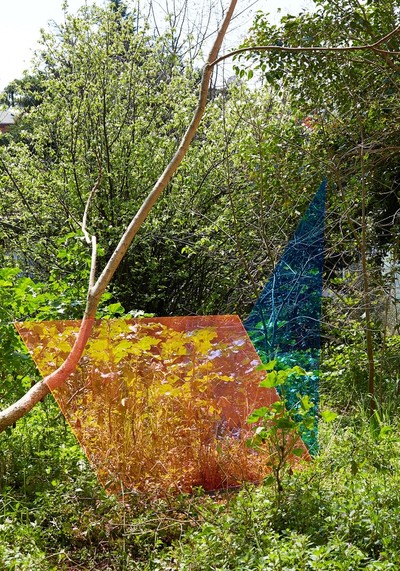 Bahar Yürükoğlu's installation, that she produced with colorful plexiglass for a hidden garden in the backstreets of the neighborhood, binds together the end points of the natural and the superficial. The installation conceptualizes a space for the future and thus questions the binaries, such as existence and absence, past and future, and nature and civilization. Constructing an alternative imaginary for the future through links to biology, ecology and art, Pınar Yoldaş' sculptures are reminiscent of a queer imaginary of the future, thanks to their cyborg-like structures. Communicating with the audience from inside a fisherman's aquarium, these sculptures also propose a distinctive ecosystem.