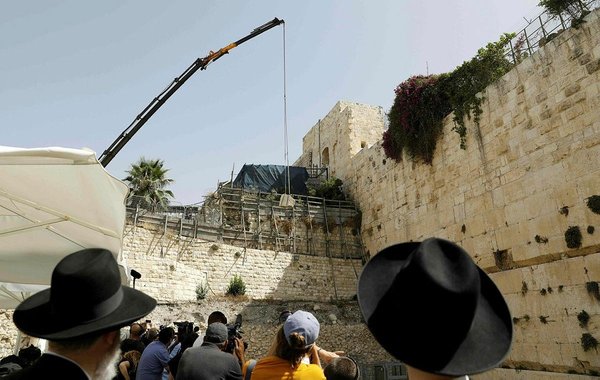 Israeli construction crews on Wednesday moved a large block of stone that fell from the Al-Buraq Wall earlier this week to a nearby area in the Al-Aqsa Mosque complex, according to the Israeli Antiquities Authority.