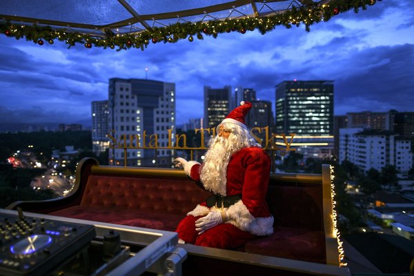 Strapped into rollercoaster-like seats, the Santa in the Sky patrons dine next to prancing reindeer models and a mannequin of jolly St Nicholas far above the city's busy traffic.