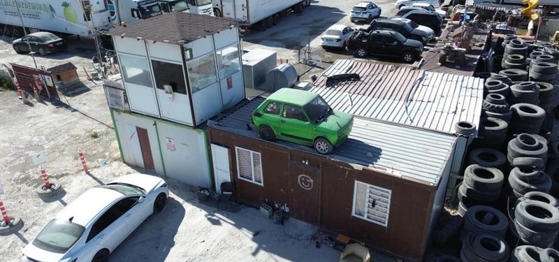 Özdemir explained, "I put the car on the container to ensure no one would touch it or steal it. My friend left the car with us because the engine was malfunctioning. I decided to put it up high so it wouldn't be left out in the open. There were engine parts inside the car, and since the engine had some issues, I wanted to keep it safe. For example, when people come to our shop from elsewhere, we tell them there's a green car on top of a container right next to us, which makes it easy to give directions. It draws people's attention."