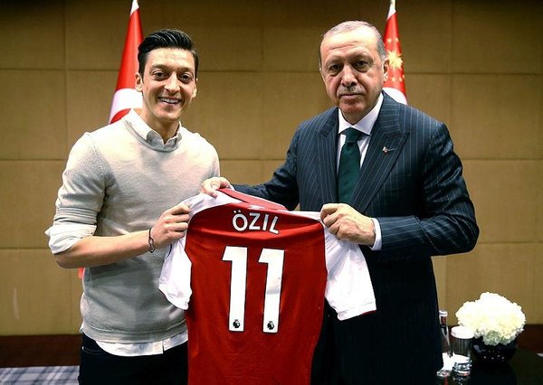 The pictures, taken in London on Sunday and published by Erdoğan's ruling AK Party, show Özil and Gündoğan standing next to the president, all three beaming, and giving him shirts from their English clubs - Arsenal and Manchester City respectively.