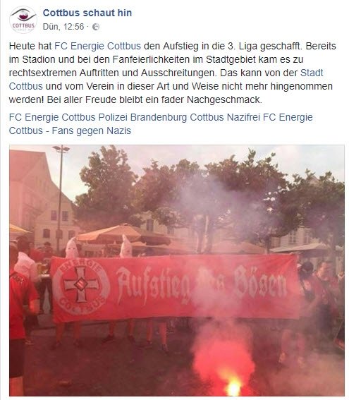 After FC Energie Cottbus won promotion to the third-tier of the German league on Sunday, a group of fans, their faces covered with hoods resembling those worn by the U.S. white supremacist group, marched holding a red banner with "The rise of the evil ones", written in gothic script.