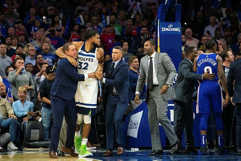 With 6:42 left in the third quarter at Philadelphia, Embiid and Towns became entangled and wrestled to the floor. Numerous players and coaches then joined in.
