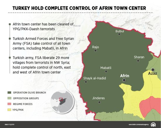 The Afrin town center is now under total control of Turkish and FSA in its north, east and western regions.