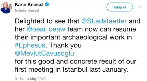 In posts made on her official Twitter account, Kneissl said she was "delighted" to see that the team would be able to resume its "important work" in Ephesus.